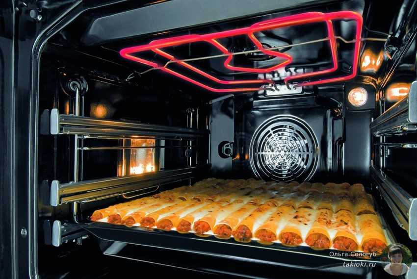 - Когда блюда занимают всю полезную площадь духовки, то увеличивают время готовки при включении конвектора. Это обусловлено тем, что отсутствует пространство для свободной циркуляции воздуха.