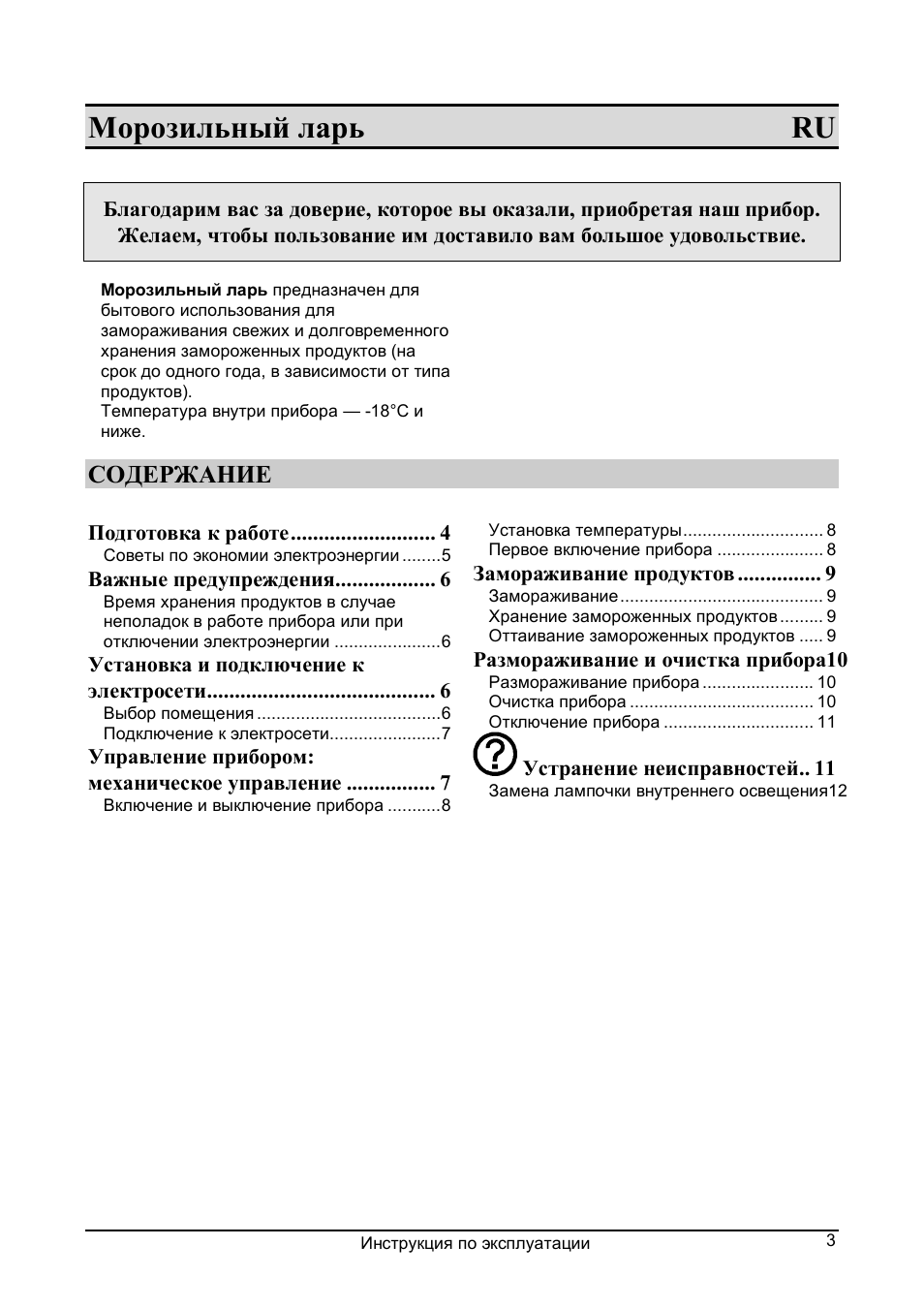 Морозильный ларь предназначен длябытового использования длязамораживания свежих и долговременногохранения замороженных продуктов (насрок до одного года, в зависимости от типапродуктов).Температура внутри прибора — -18°С иниже.