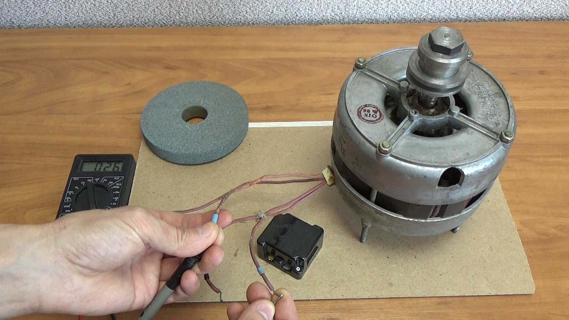Следующий этап работ — подключение двигателя от стиральной машины к электрическому проводу с вилкой своими руками. Для этого необходимо у мотора от советской машинки найти пусковую и рабочую обмотку. Для этого используют мультиметр и замеряют сопротивление. Сопротивление рабочей -12 Ом, а пусковой обмотки – 30 Ом. К электрическому кабелю подключают выводы рабочей обмотки. При таком подключении точильному кругу нужно будет задавать вращение рукой. Поэтому многие делают для этого пусковую кнопку.