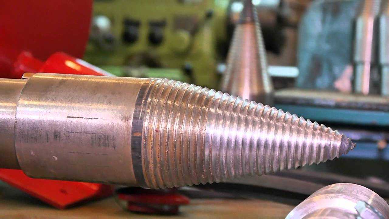 На простом токарном станке такой инструмент не выточить. К тому же шаг резьбы рассчитывается под обороты вращения вала. Многие самодельщики для удешевления не устанавливают редуктор, и крепят конус для дровокола непосредственно на вал двигателя. При таком исполнении шаг должен быть мелким, а сама резьба неглубокой.