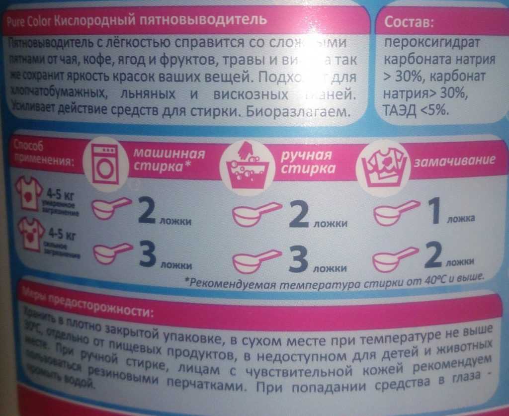 - кислород. Это сильный окислитель, хорошо устраняющий загрязнения различной природы. Кислородные пятновыводители экологически безопасны, хорошо выполаскиваются, не разрушают красящие вещества. Попадая в подогретую воду, связанный кислород высвобождается и оказывает очищающий эффект;