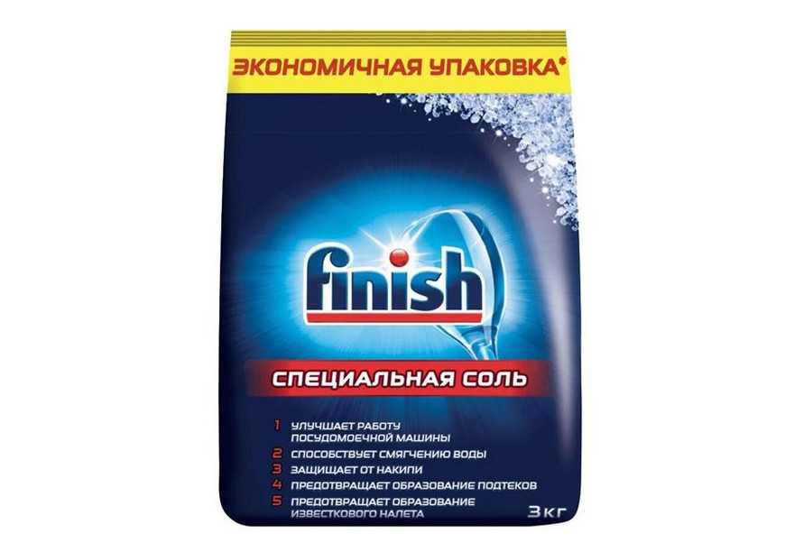 Завершает наш рейтинг вариант от компании Финиш, выпускаемый в формате порошка. В качестве упаковки используется пакет, вмещающий 3 кг средства. Соль улучшает эффективность работы прибора, усиливает воздействие компонентов моющего средства и ополаскивателя. Хорошо смягчает даже самую жесткую воду, способствует удалению накипи на разбрызгивателях, сливной трубе и других элементах ПММ. Порадует доступной ценой, тем более при учете доступного объема, исключит появление подтеков и следов капель на посуде.