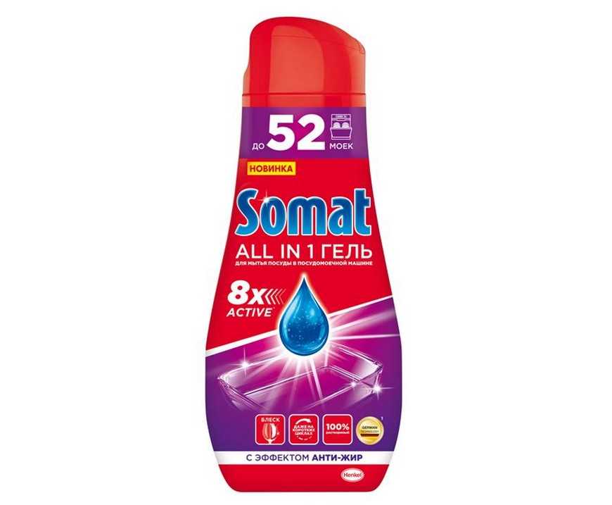 В представленной линейке такого производителя – это лучшее средство для посудомоечной машины. Усовершенствованный очиститель не только устранит пятна и жир, но выполнит функцию ополаскивателя, придавая кухонной утвари новизну, сияние. Формула кроме готового набора (это сода, кислотный отбеливатель, фосфонаты, ПАВ и карбоксилаты) дополнена солью, за счет которой предупреждается образование известкового налета. Также средство для посудомоечной машины Сомат обладает функцией «Пауэр Бустер», что позволяет даже без замачивания удалять засохшие частицы пищи. В продаже есть упаковки разного объема от 26 до 100 единиц.