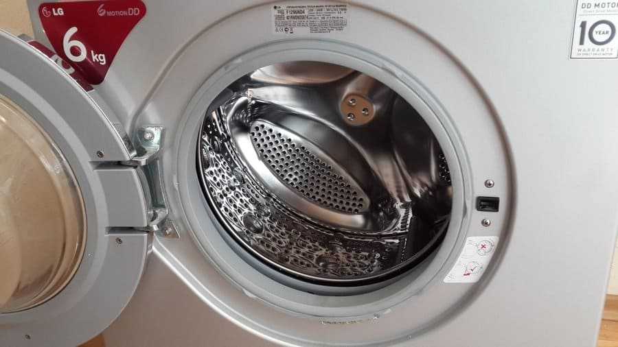 - LG F-10B8ND. Узкая стиральная машинка с прямым приводом. Интегрирована функция различного вращения барабана в зависимости от типа ткани и интенсивности загрязнений. Техника имеет фронтальный тип загрузки и рассчитана на 6 кг. Стоит отметить, что модель работает довольно тихо. Производитель предлагает 13 режимов стирки, среди которых отдельные программы для пуховых одеял, детских вещей. Есть опция стирки «Забота о здоровье», которая удаляет различные аллергены с ткани. Вещи отжимаются при 1000 об/мин. В результате одежда слегка влажная, а волокна ткани не повреждаются.