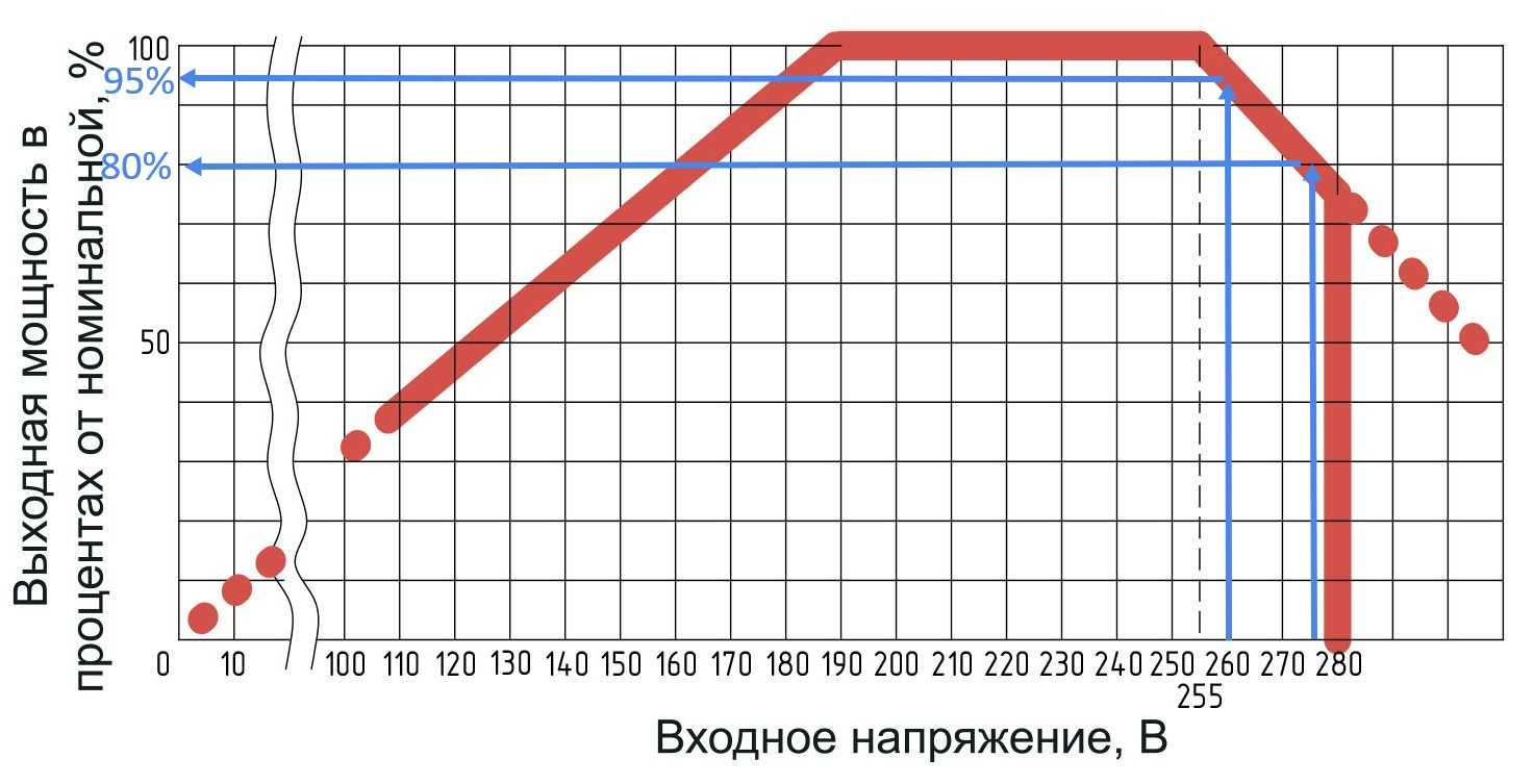 Уже при 255В стабилизатор начинает терять в мощности, а при 275В способен выдать только 80% от заявленных значений. При 280В идет защитное отключение.