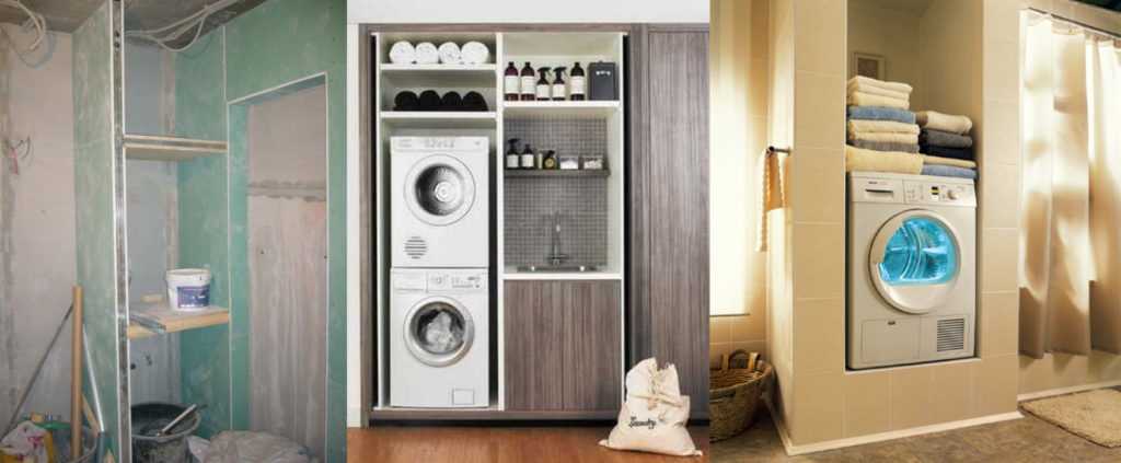 Во время домашнего ремонта можно продумать вариант монтажа сушилки и заранее заняться изготовлением для нее ниши из гипсокартонных плит. Вариант сложнее, но комфортнее в использовании – соорудить высокий шкаф для установки колонны техники. Представленные на фото примеры помогут вам реализовать эти идеи.