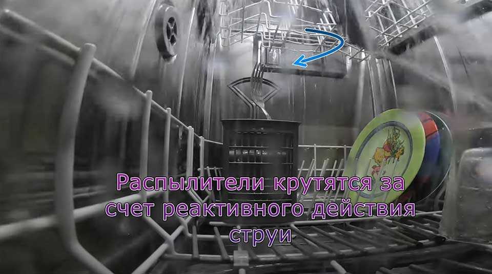 После нагрева и подготовки вода под давлением направляется в разбрызгиватели сверху и снизу. В некоторых ПММ такие распылители имеются по бокам.