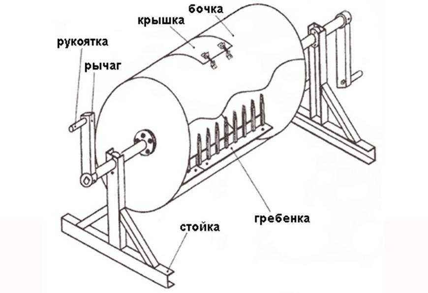 Каркас сварен из швеллера (уголка). В нижней части просверливаются отверстия: в центральной части – для установки вала, сбоку – для сливного люка.