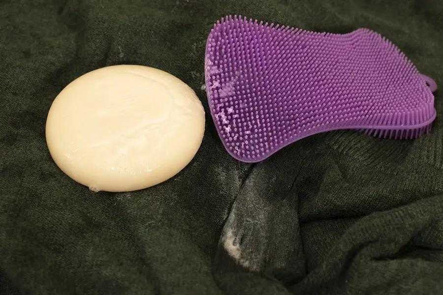 Получившуюся смесь густо нанесите на пятно. Для плотной ткани при этом используйте зубную щетку. Для нежного материала лучше подойдет силиконовая терка. Трите пятно, пока оно не исчезнет. Оставьте средство на пятне на 5 минут, еще немножко потрите и сполосните ткань. Положите эту одежду также замачиваться на 20 мин.