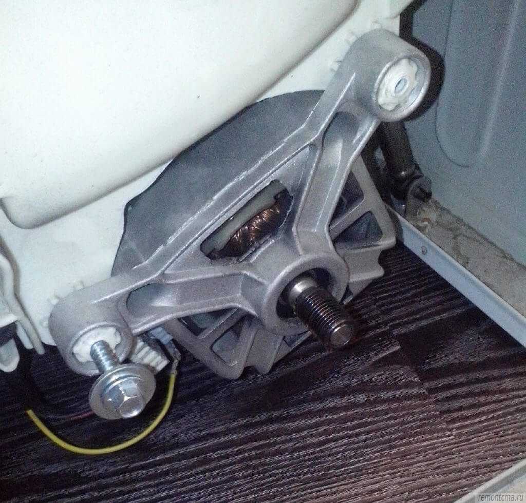 Применив ключ на 8 мм, выкрутите болты, фиксирующие мотор. Возьмитесь за движок и начните его раскачивать. Это поможет вытащить элемент из корпуса стиральной машины. Учтите, что двигатель достаточно тяжелый, поэтому рассчитывайте собственные силы.