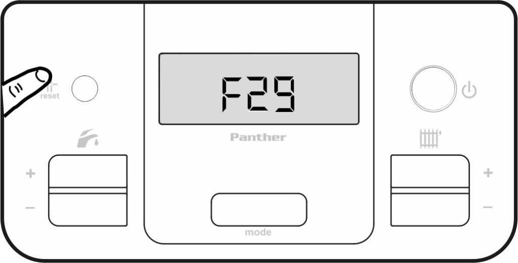 Устранение через кнопку сброс ошибки F29 на панели управления котлом Protherm
