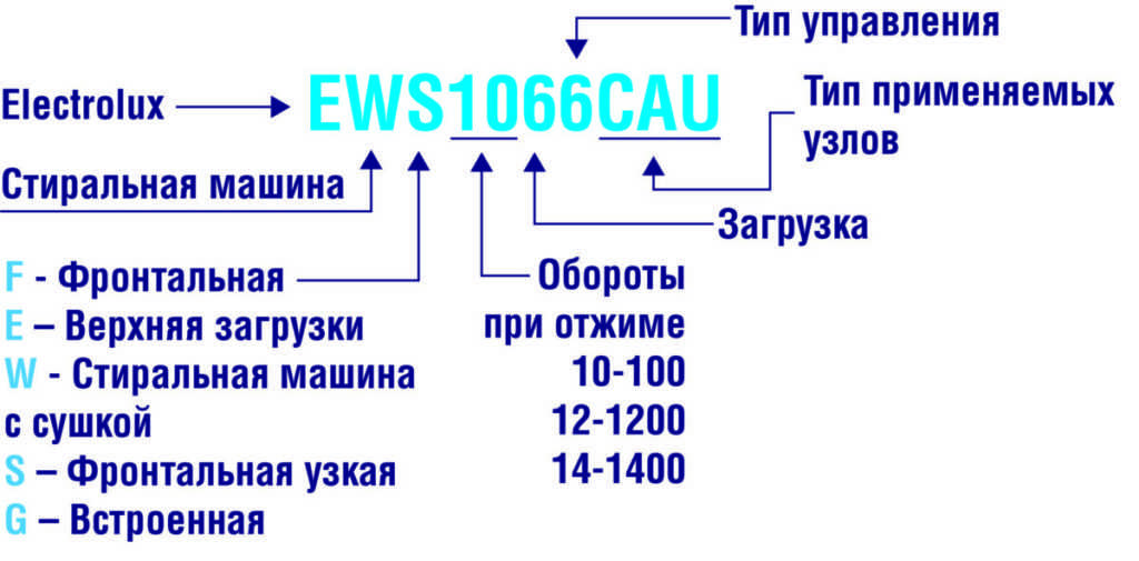 Вторая буква обозначает тип СМА. Английская буква L указывает на то, что это узкая стиральная машина с фронтальным типом загрузки белья в барабан с глубиной 45 см. Другие вариации букв: