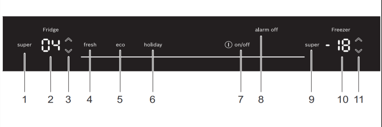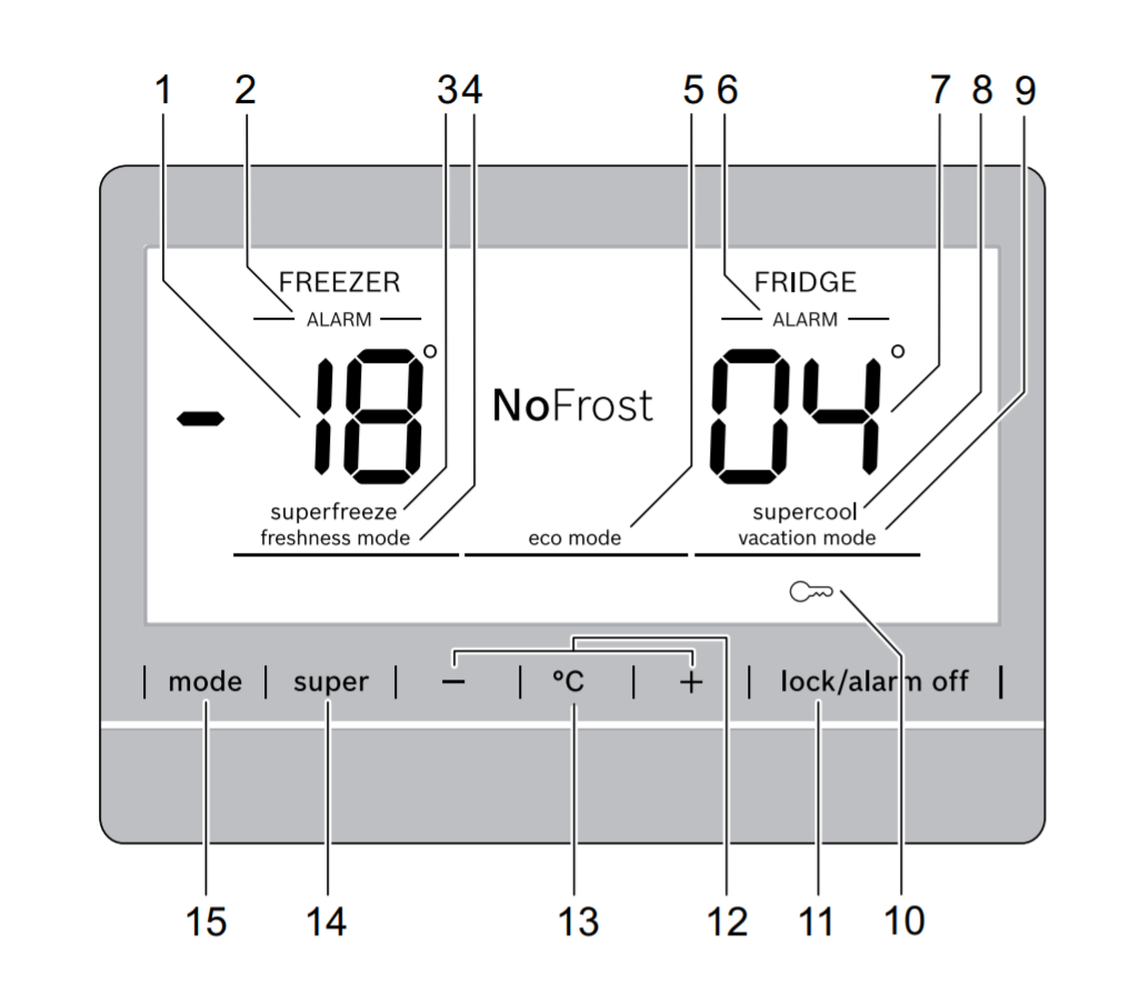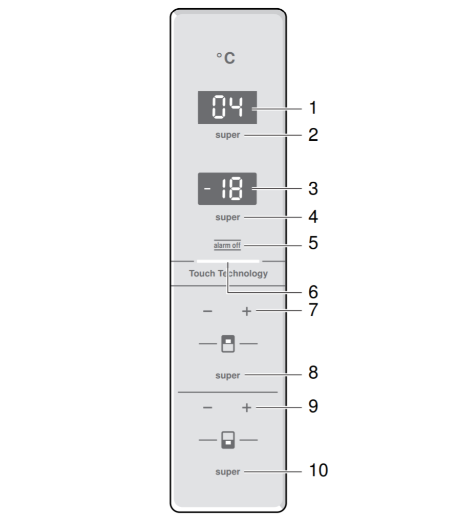 В такой компоновке можно аппаратным способом проверить, есть ли неисправность в системе. Для этого нужно выключить холодильник на 10 минут, затем включить и нажать кнопку alarm или одновременно кнопку настройки и °C и дождаться продолжительного звукового сигнала. Когда закончится автоматическая проверка, аппарат издает короткие сигналы: два означают, что все в порядке, пять — что техника нашла поломку. Но конкретную неисправность дисплей не показывает.