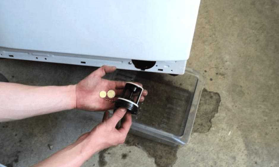 Перед тем, как выкрутить фильтр (находится внизу под загрузочным люком), необходимо подставить невысокую ёмкость для слива воды. Если фильтр засорён, необходимо его прочистить и установить обратно.