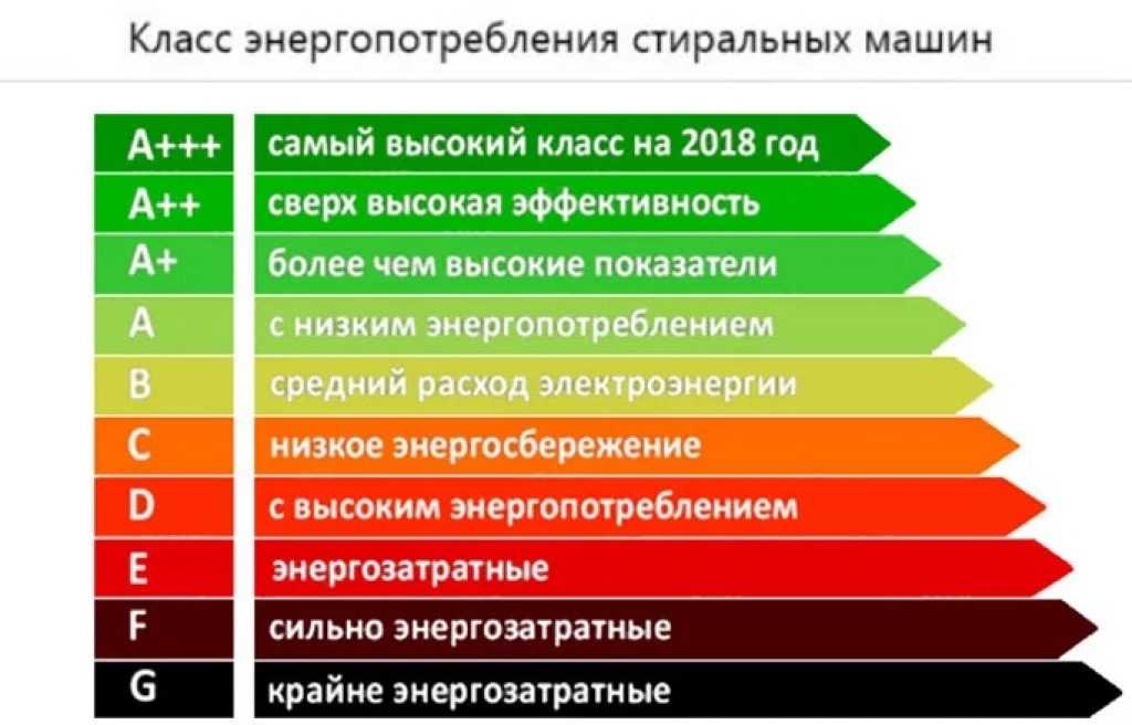 Эффективность работы стиральных машин оценивается по совокупности трех параметров: класса энергопотребления, качества стирки и степени отжима. Для удобства пользователей все эти параметры принято оценивать по особой шкале, согласно которой стиральные агрегаты подразделяются на 7 категорий, обозначаемых литерами латинского алфавита. Машины самого высокого класса маркируются литерой A, самого низкого – литерой G.