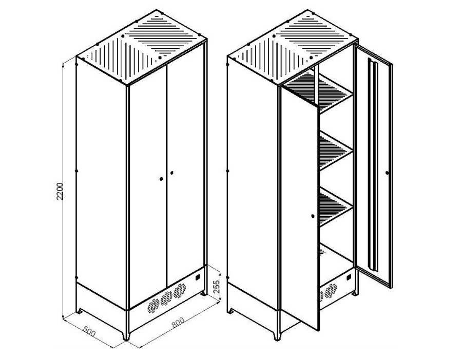 Предназначен такой агрегат для одежды, обуви, инструментов, инвентаря, внутри металлического короба есть полки и секции с вешалками. Объем загрузки зависит от выбранной модели, может быть вертикальной и горизонтальной формы. Короб шкафа металлический, полки и секции перфорированные.