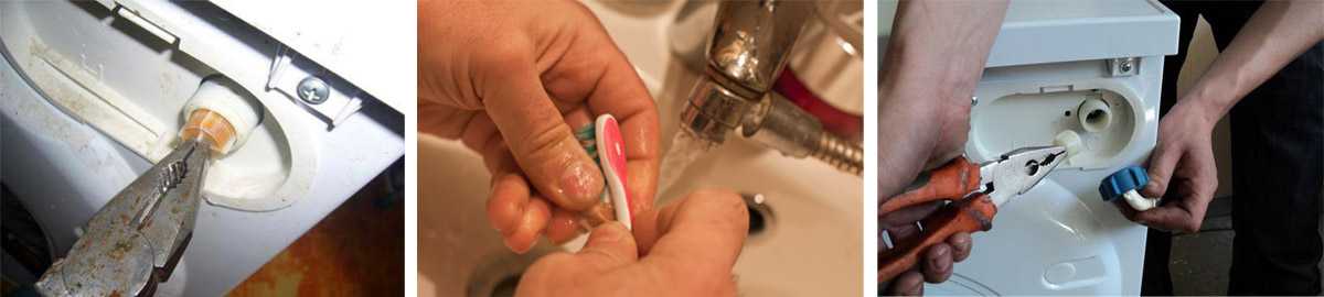 Если прочистка заливного шланга не дала результатов, стоит проверить входной фильтр-сеточку. Мелкая сетка часто забивается мусором и перестает пропускать жидкость. Алгоритм действий будет таковым: