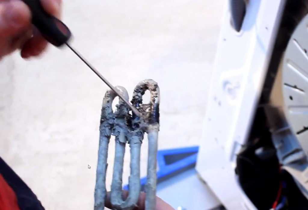 Вначале нагреватель следует очистить от слоя накипи. Если при осмотре ТЭНа вы увидели черные пятна на нем, есть большая вероятность, что произошел пробой. Такой нагреватель требуется заменить на новый. В случае, когда пятен нет, его желательно “прозвонить” тестером. Для этого переключаем прибор на измерение сопротивления, и измеряем его между двумя контактами нагревателя.