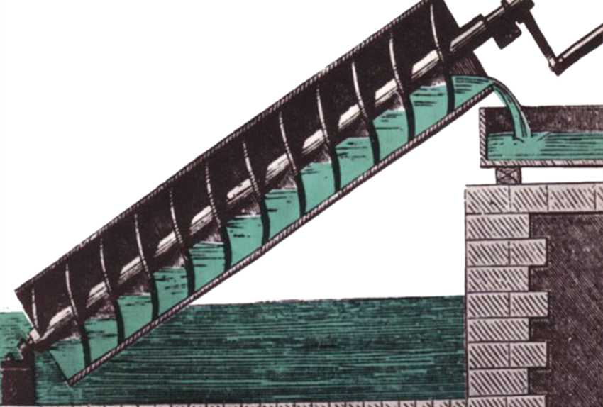- Применение Архимедова винта. Устройство состоит из полого цилиндра и помещенного в него винта с ручкой для вращения. Систему нужно опускать в источник под углом. Винт, приведенный в движение механическим способом, забирает воду и подает ее наверх.