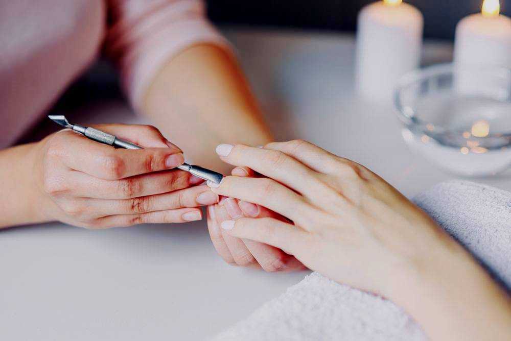 После размягчения кутикулы, тупым концом нужно осторожно поддеть кожицу и сдвинуть к основанию ногтя;