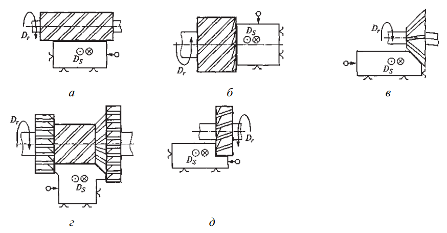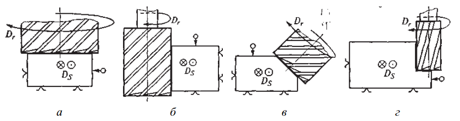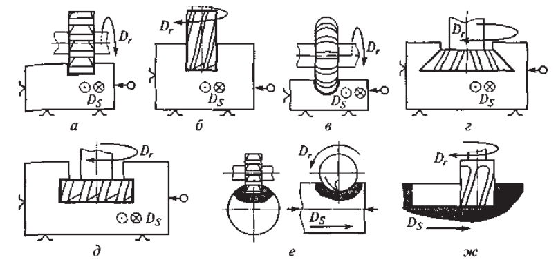 Рис. 24. Обработка плоскостей на ГФС: а – горизонтальных; б – вертикальных; в – наклонных; г – нескольких плоскостей одновременно; д – уступов; Dr – движение резания; Ds – движение подачи