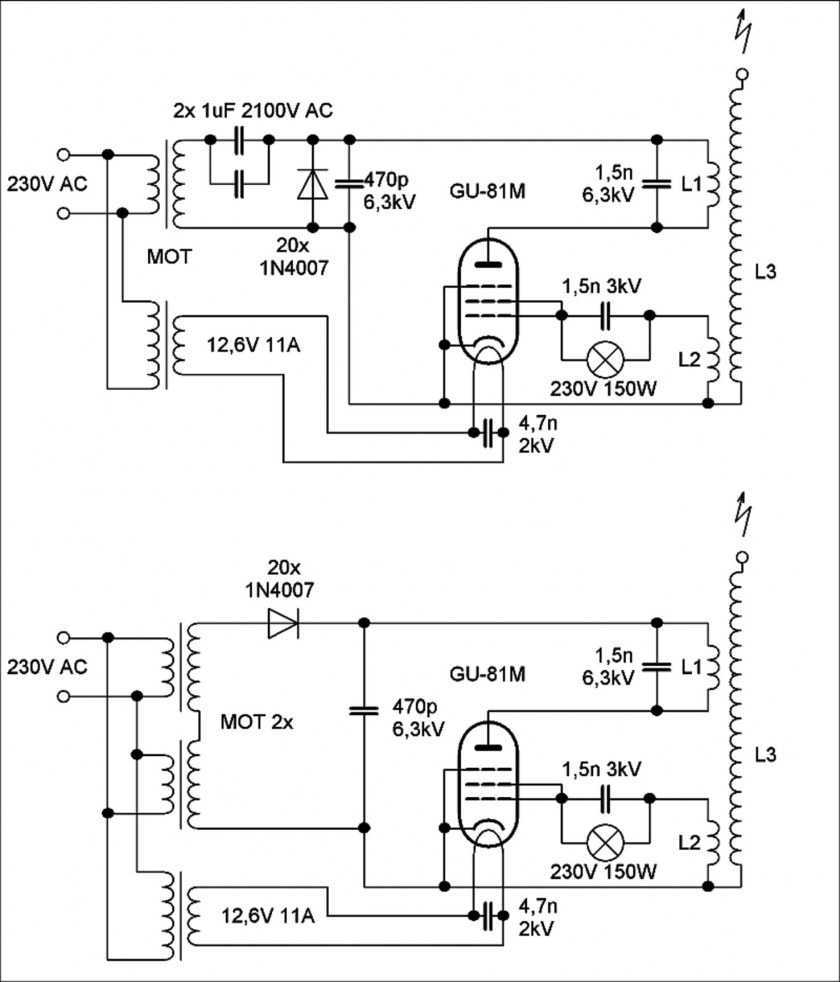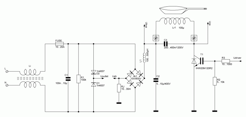 Принципиальная схема индукционной плиты довольно сложная, и может существенно отличаться для различных моделей. Особенно блок электронного управления. Хотя основа — генератор, драйвер на транзисторах средней мощности и выходной биполярный транзистор с изолированным затвором, типа IGBT H20R1202 (IRGP 20B120), который управляет катушкой индуктора, одинакова у всех плит. Несколько электросхем показаны ниже — клик для увеличения.