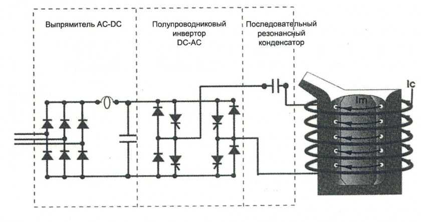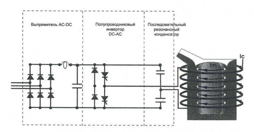 Она выполняется с учетом расчетной мощности агрегата, вихревых потерь и утечек на гистерезисе. Питание конструкции будет идти от обычной сети в 220 В, но с использованием выпрямителя. Такой вид печи может идти с графитовыми щетками или нихромовой спиралью.