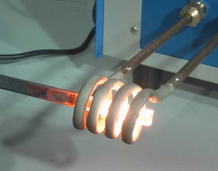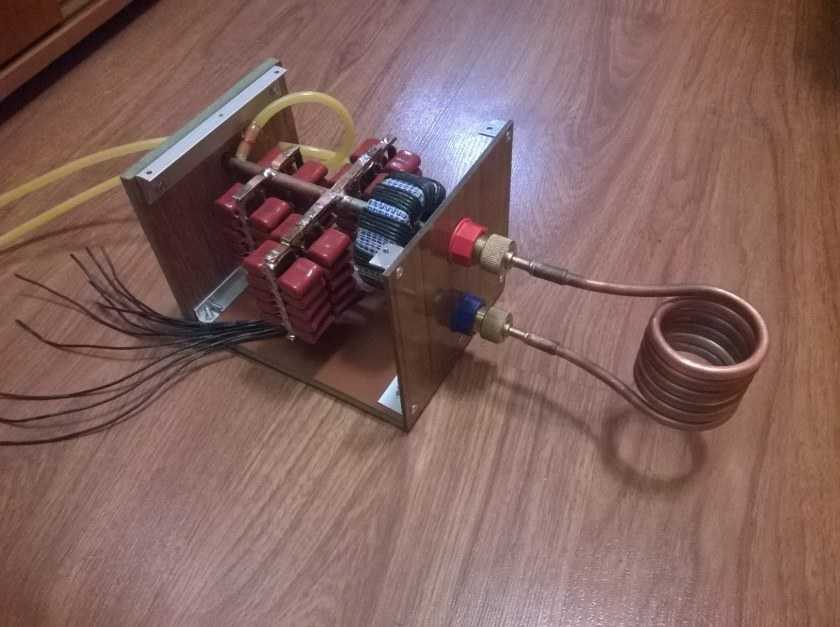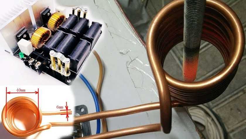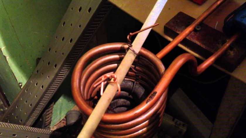 Количество витков нагревательной катушки должно быть не менее 8–10. Необходимое расстояние между витками 5–7 мм, а диаметр медной трубки обычно составляет 10 мм. Минимальный зазор между индуктором и другими частями прибора должен быть не менее 50 мм.