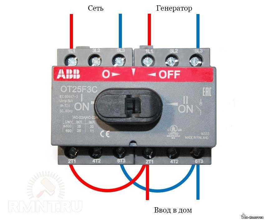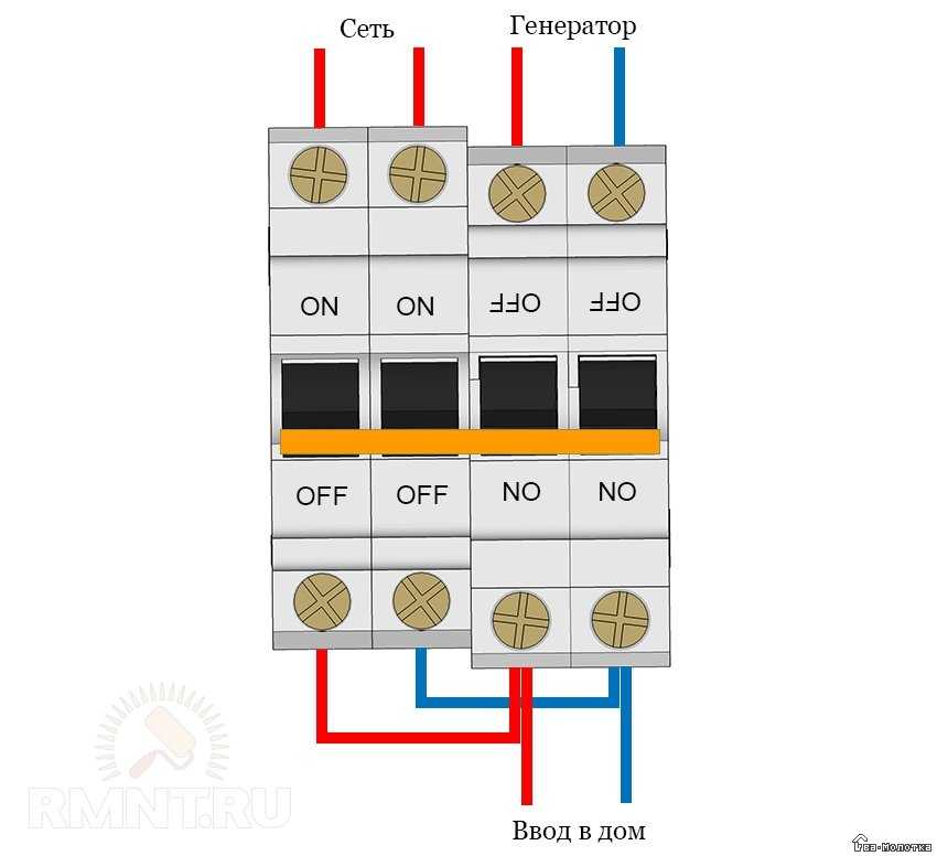 Чтобы исключить манипуляции с проводами и клеммами и сделать все правильно, подобную схему подключения можно воссоздать при помощи перекидного рубильника, который переключает домашнюю сеть с основного на резервный источник питания. Для исключения всех возможных аварийных ситуаций, перекидной рубильник должен быть двухполюсным для однофазной сети, или четырехполюсным для включения в трехфазную систему.