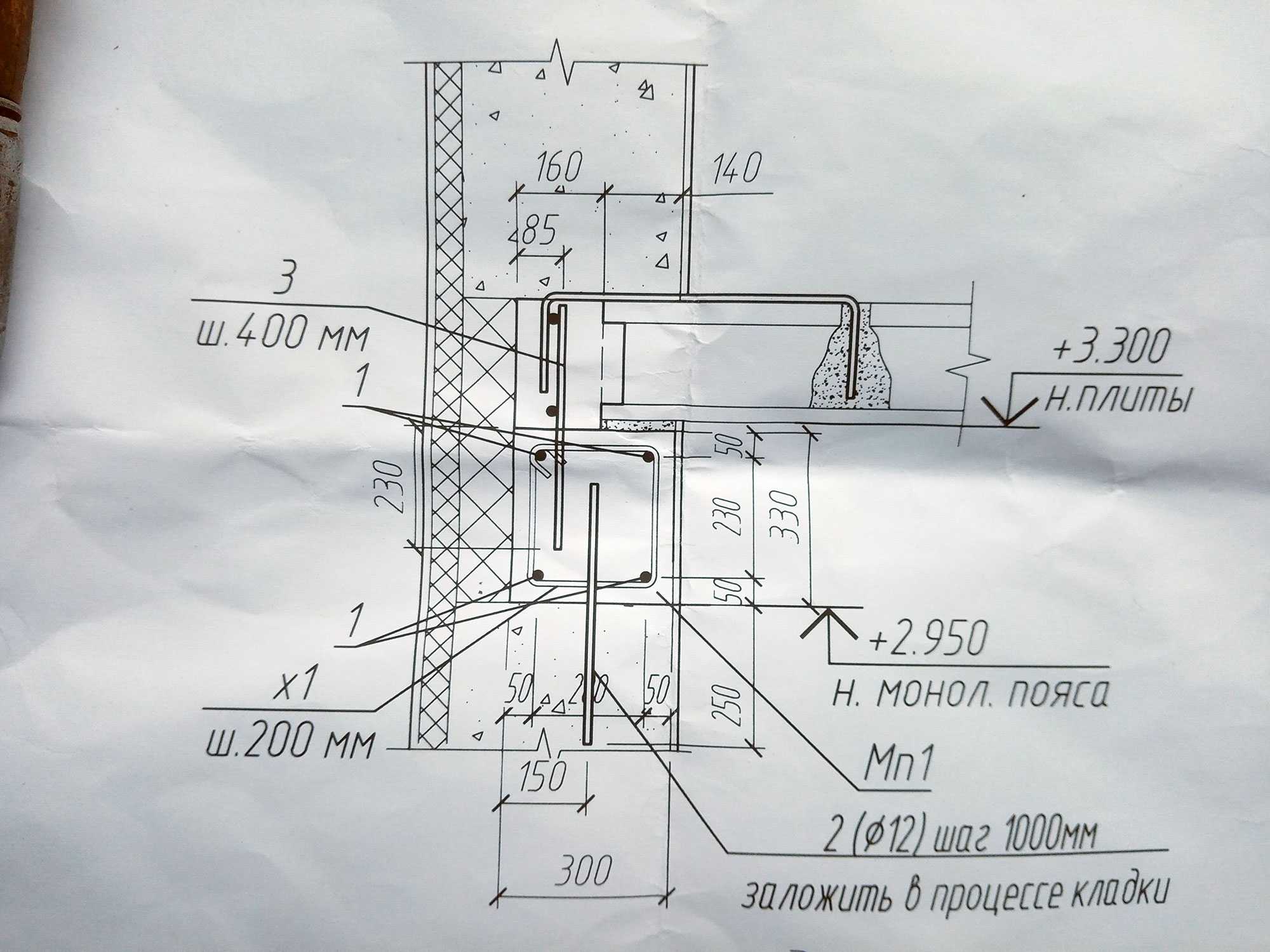 Схема армирования и устройства армопояса под плиты перекрытия. Основная арматура 10 мм, дополнительное усиление над проемами пруты 16 мм, шаг хомутов 200 мм.