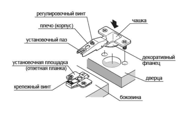 крепежные устройства для крупногабаритных шкафов выполняют функции открытия створок По техническим характеристикам это механические детали; немаловажное значение имеют материалы, из которых изготовлены двери, одним из значимых показателей является их толщина; во внимание также берется материал петель: их изготавливают из сплавов, отличающихся устойчивостью к деформациям и коррозии.. Накладные крепежи с четырьмя шарнирами имеют один принцип крепления:. Накладные крепежи с четырьмя шарнирами имеют один принцип крепления: