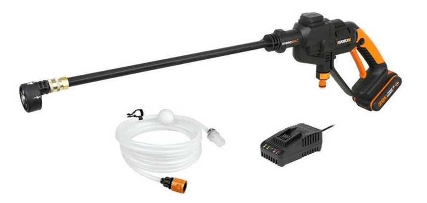 Популярная модель компактной аккумуляторной мойки, которая пригодится для быстрой очистки автомобиля или сельскохозяйственной техники. Продается вместе с элементом питания в комплекте, поршни здесь пластиковые, поэтому не стоит перегружать аппарат. К мойке подключается шланг длиной 6 метров, забор воды возможен из емкости. За час насос пропускает не более 120 л, а давление струи достигает всего 22 бар, но для работы с простыми задачами таких характеристик достаточно. Покупатели хвалят модель за компактные размеры и вес менее трех килограммов, руки не устают.