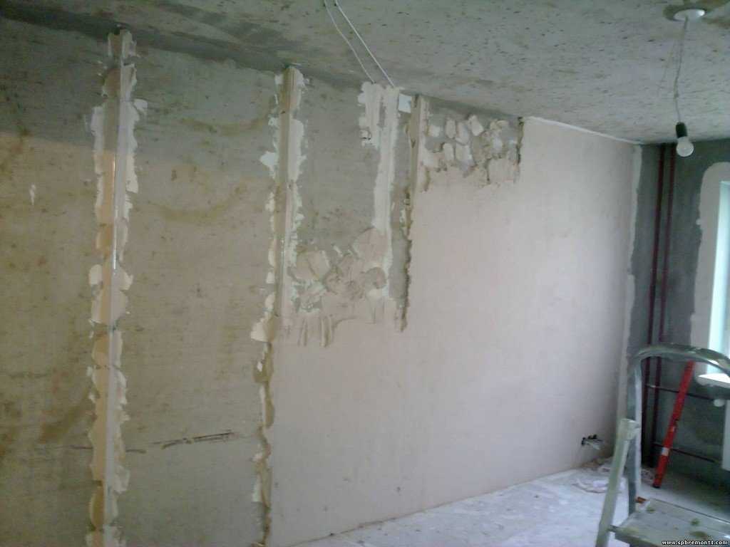 - Старая отделка, если она ветхая и плохо держится на стенах, удаляется в обязательном порядке.