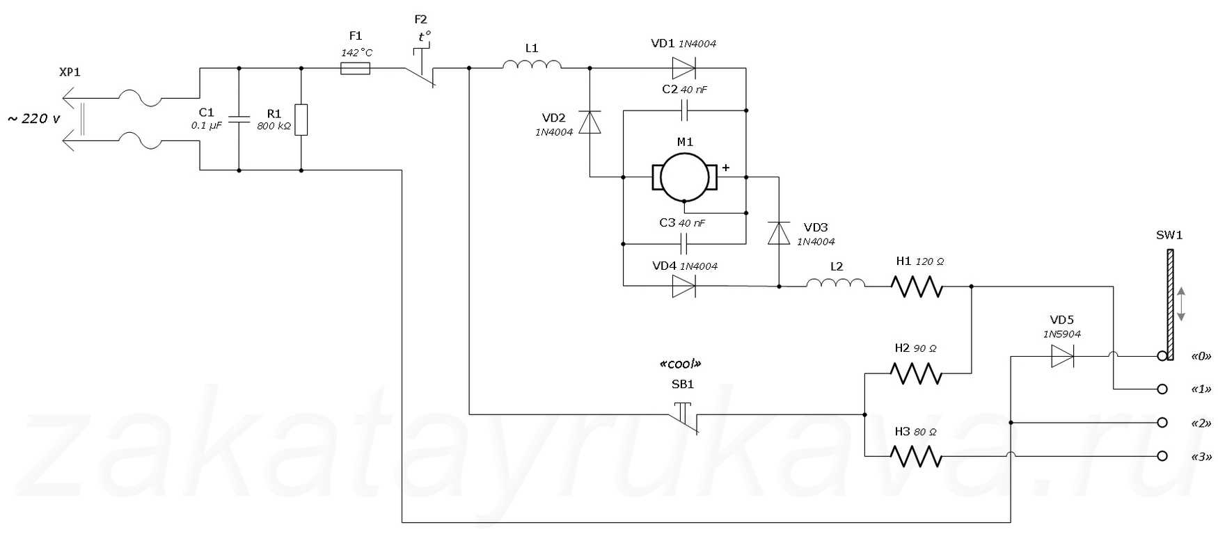 В целом электросхема всех приспособлений одинакова. Число спиралей Н указывает на число режимов — если на устройстве 3 спирали, то Н1 отвечает за подачу питания на двигатель, а Н2 и Н3 — за нагрев. Самое верхнее положение SW1 свидетельствует об обесточивании системы. В первом положении девайс функционирует на минимальной мощности, поскольку включается только одна спираль, во втором — на средней (работает 2 единицы), а в третьем — на максимальной (включены все 3). Если есть кнопка «cool», значит аппарат может работать без обогрева, то есть второй и третий спиралевидные элементы отключаются, а двигатель работает, выдувая холодный воздух. Также в схему входят катушки индуктивности L1, L2 и конденсаторы С1, С2, минимизирующие помехи при работе, а также термопредохранитель F1 и термостат F2.