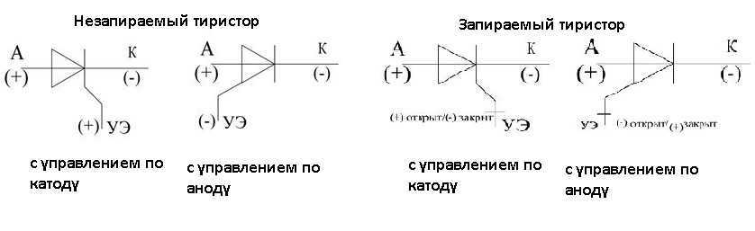 Есть также разные виды тиристоров по способу запирания. В одном случае достаточно уменьшения анодного тока ниже уровня тока удержания. В другом случае — подается запирающее напряжение на управляющий электрод.