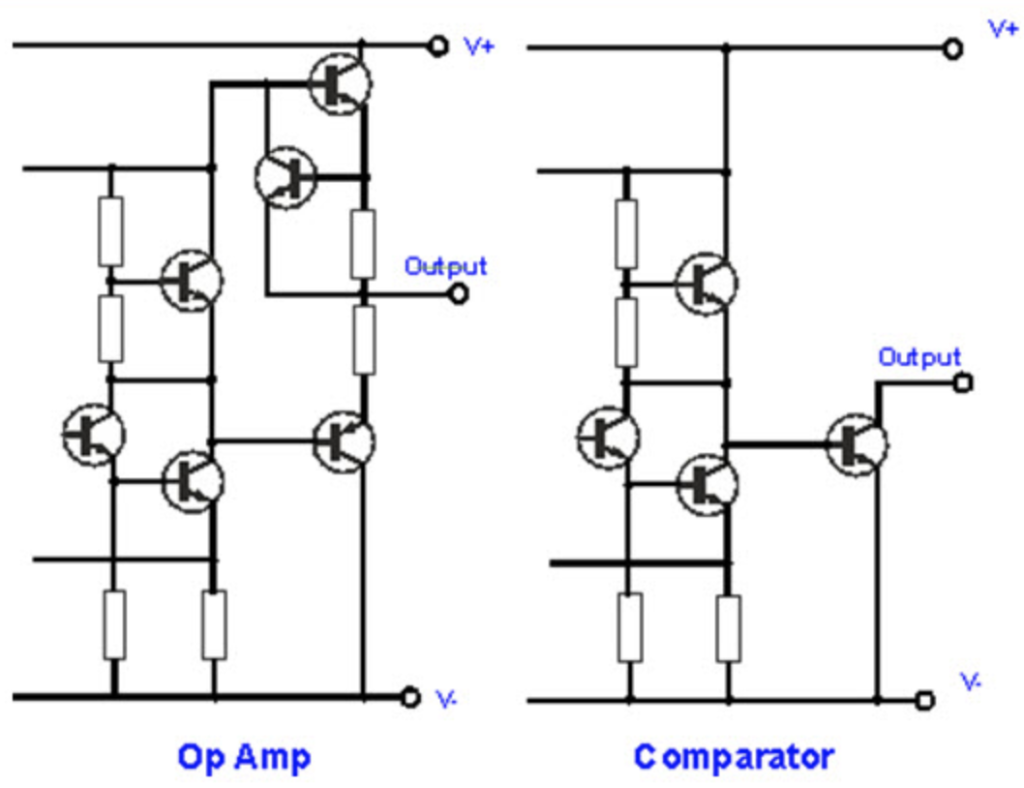 Операционные усилители часто могут использоваться в качестве компараторов напряжения, если к выходу усилителя добавлен диод или транзистор), но реальный компаратор разработан так, чтобы иметь более быстрое время переключения по сравнению с многоцелевыми операционными усилителями. Таким образом, можно сказать, что компаратор – это модифицированная версия операционных усилителей, специально разработанная для работы с цифровым выходом.