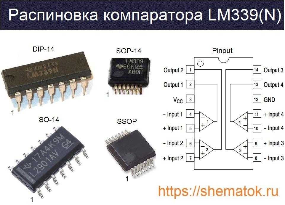 Микросхема с маркировкой «LM339N» выпускается в стандартной пластиковой упаковке для дырочного монтажа PDIP, и с «LM339» для поверхностного – SOIC, SOP, SSOP. Такое обозначение на корпусе является основным отличием данных устройств, которые по электрическим параметрам полностью идентичны. Развернутая распиновка, с указанием назначения выводов, представлена на рисунке.