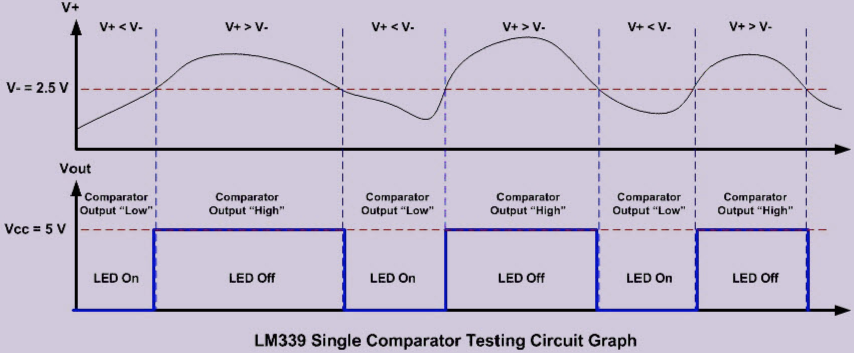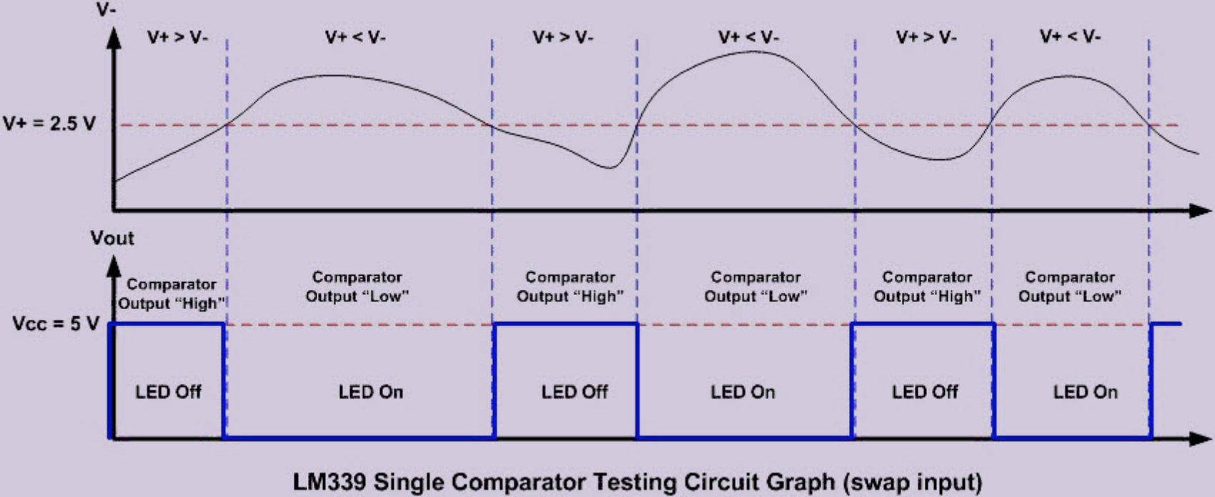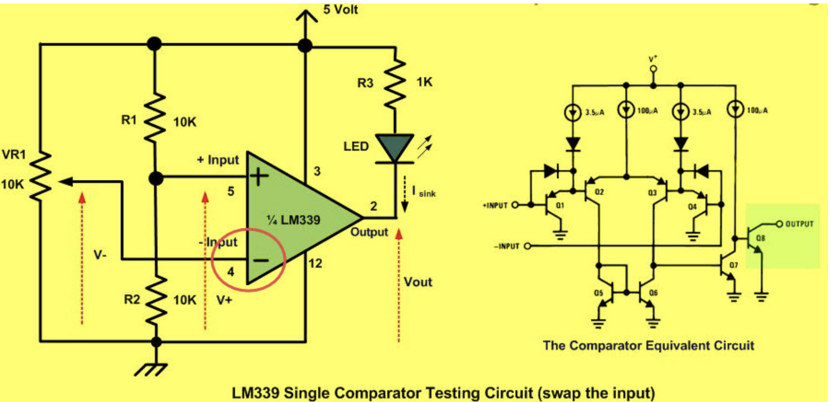 Путем подачи аналогового сигнала на вход + компаратора, называемый «неинвертирующим», и – вход, называемый «инвертирующим», схема компаратора будет сравнивать эти два аналоговых сигнала, если аналоговый вход на неинвертирующем входе больше, чем аналоговый вход на при инвертировании выходной сигнал перейдет в высокий логический уровень, и это заставит с транзистор открытым коллектором Q8 на эквивалентной схеме LM339, приведенной выше, включиться. Когда аналоговый вход на неинвертирующем входе меньше аналогового входа на инвертирующем входе, тогда на выходе компаратора будет низкий логический уровень.