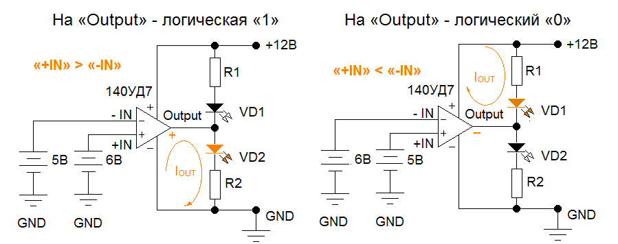 Если сравниваемое напряжение на «+IN» больше, чем на «-IN», относительно «Gnd», то на выходе «Output» появится положительный потенциал – «логическая единица». Через светодиод VD2 с ограничивающим резистором R1 на землю «GND» потечёт ток (IOUT) питающего напряжения. VD2 при этом засветится, а VD1 будет выключен.