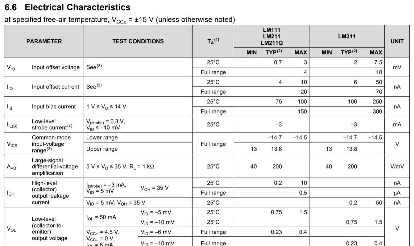 LM339(N) нельзя использовать в режиме линейного усиления как обычный ОУ. Наиболее частое применение в качестве электронного ключа, предъявляют ему немного другие требования. Одним из которых является высокое быстродействие. Приведём основные значения его предельно допустимых характеристик: